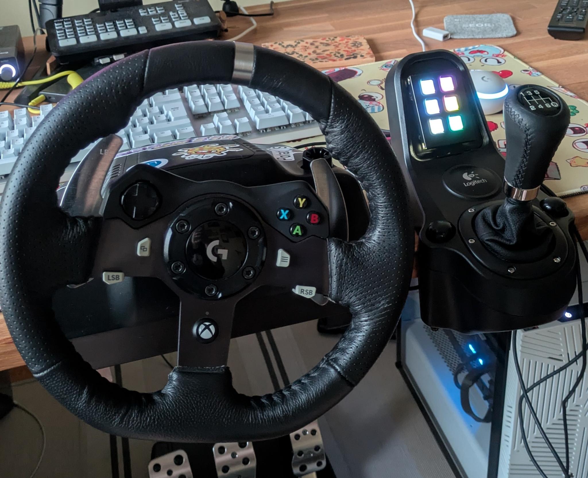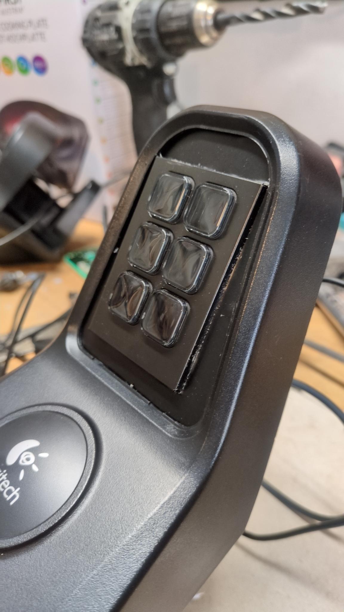 Nach Aufschrauben des G27 Shifters, Entfernen der Platine und Buttonhalterung, habe ich eine eigene Blechplatte ausgeschnitten. Für das Elgato Stream Deck Module wurde eine passende Form mit Hilfe eines Dremels rausgefräst und anschließend das Blech mit schwarzer Vinylfolie überzogen. Schnell noch die Platine vom Driving Force Shifter ins G27 Gehäuse eingebaut und ein Loch auf der Rückseite gebohrt, um das Stream Deck Kabel nach außen zu führen.